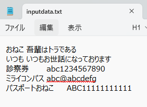といった感じでテキストファイルを用意する。ファイル名はひとまずinputdata.txtとしている。
