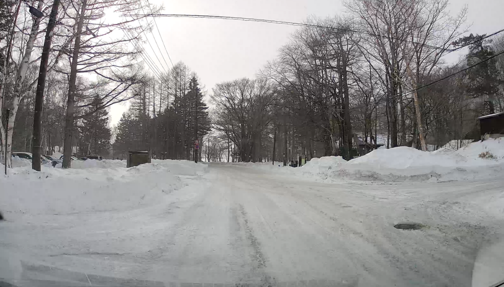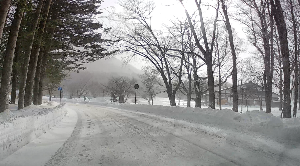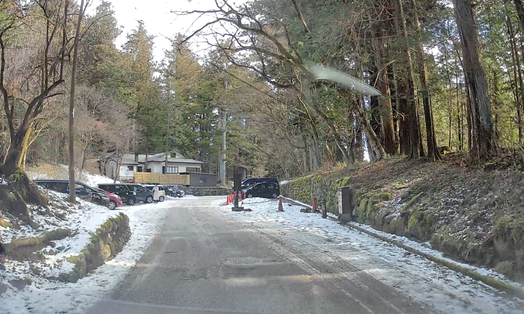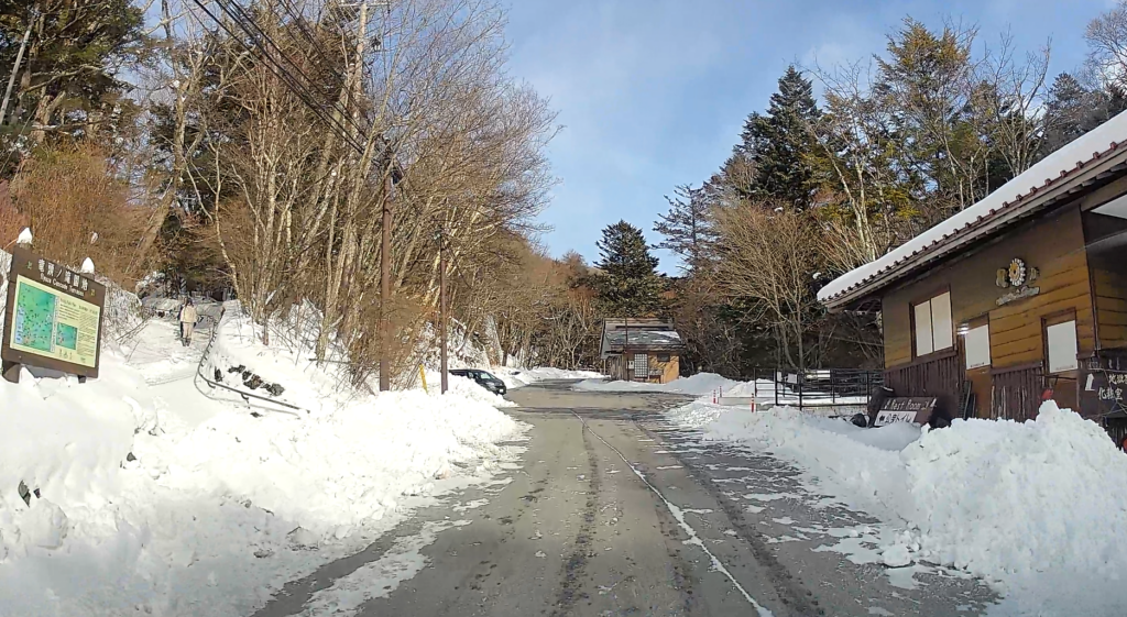 ホテルを出て数分。湯ノ湖に続く道路。左手に駐車場。