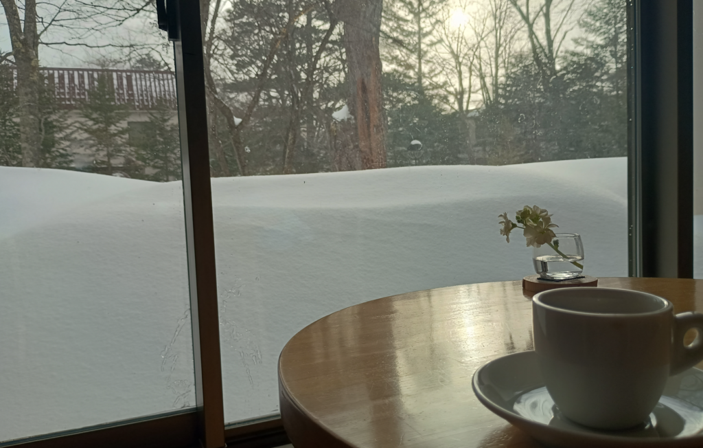 朝食後、コーヒーを飲みながら外を眺める。 昨夜は雪が数センチ降った様子。