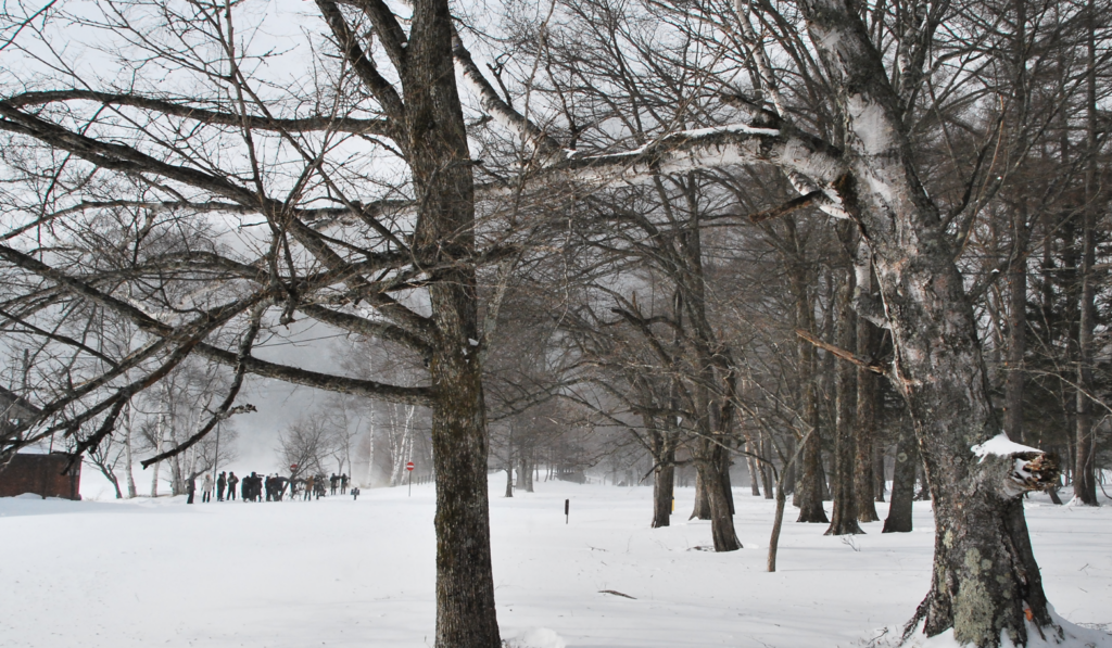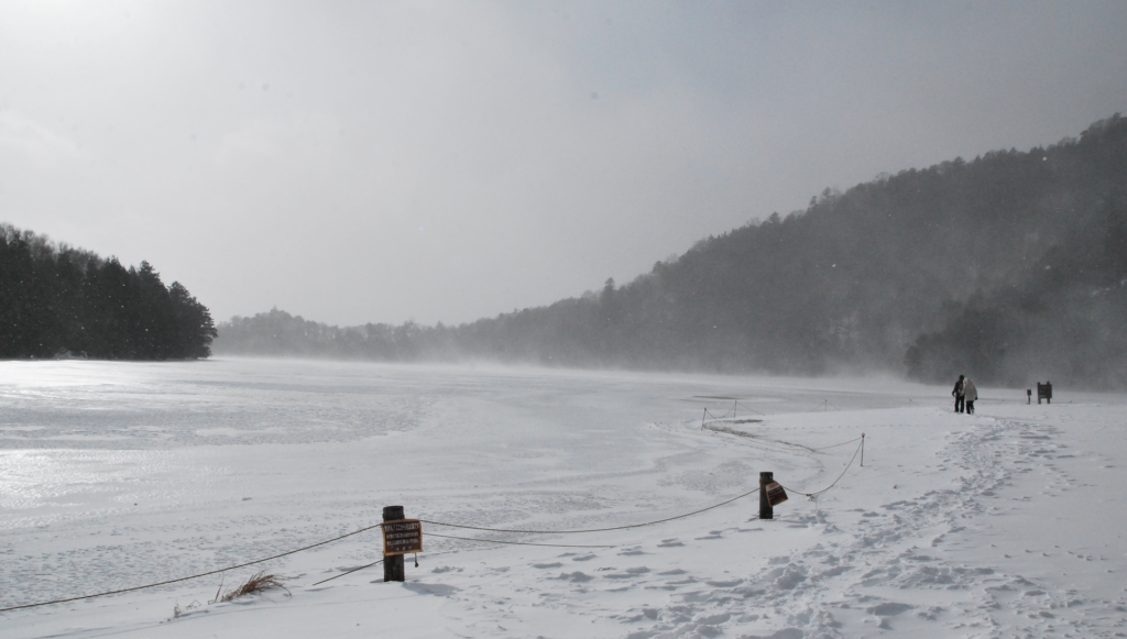 吹雪いている。奥に湯ノ湖。