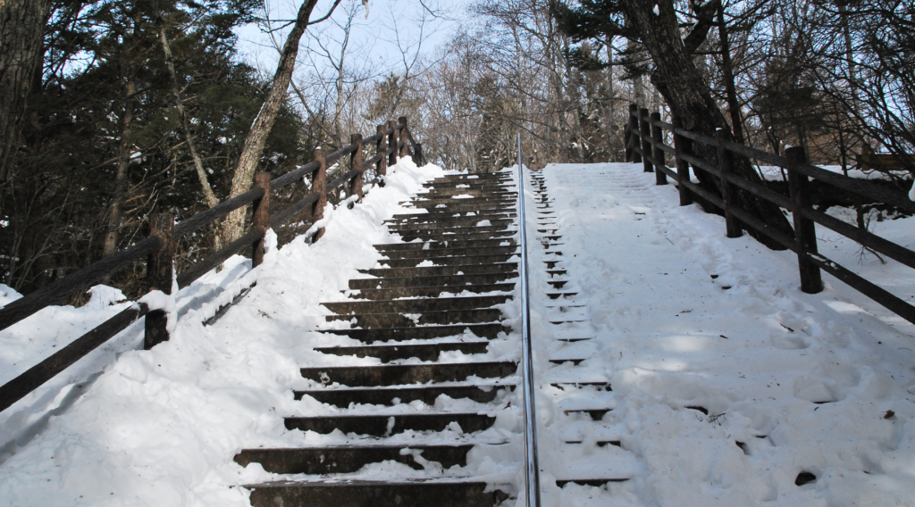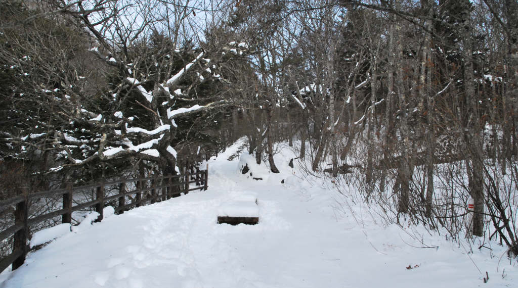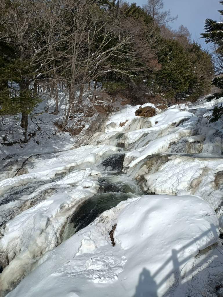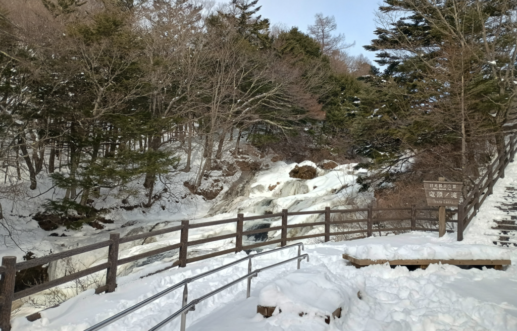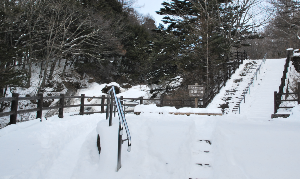 写真の左側の、雪に埋もれた歩道を上ると滝がある。